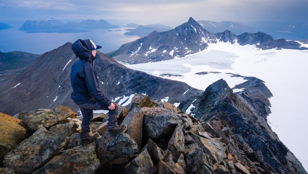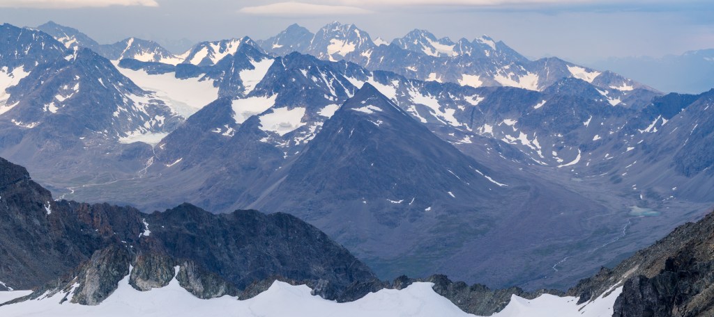 Korkeutta 1219m, alhaalla kruunun pohjalla suuri jäätikkö ja etelän suuntaan aukesi todella hienot näkymät Etelä Lyngenin suurimmille huipuille.