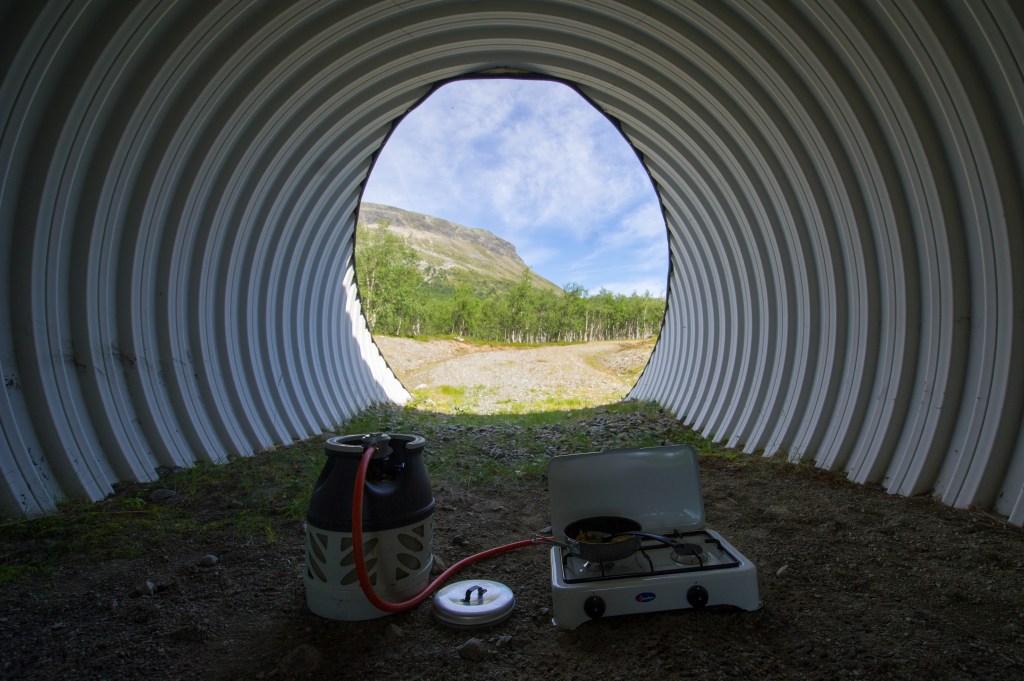 Seuraavana päivänä huristeltiinkin jo Norjan puolelle. Kilpisjärvellä oli pakko syödä kun nälkä kurni, mutta oli taas niin kuuma ettei meinannu tulla mistään mitään. Raahattiin ruuanteko vehkeet siltarumpuun. Siellä oli mukavan viileää. Hyttyset oli tosin keksineet saman lymypaikan.