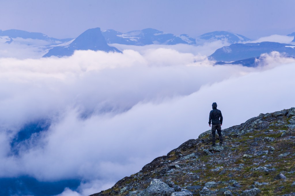 Pääsin ensimmäisen mäen ylös Litlegaltenin ja Storgaltenin väliselle harjanteelle. Länsi puolella aurinko laski ja värjäsi sadekuurot oransseiksi.