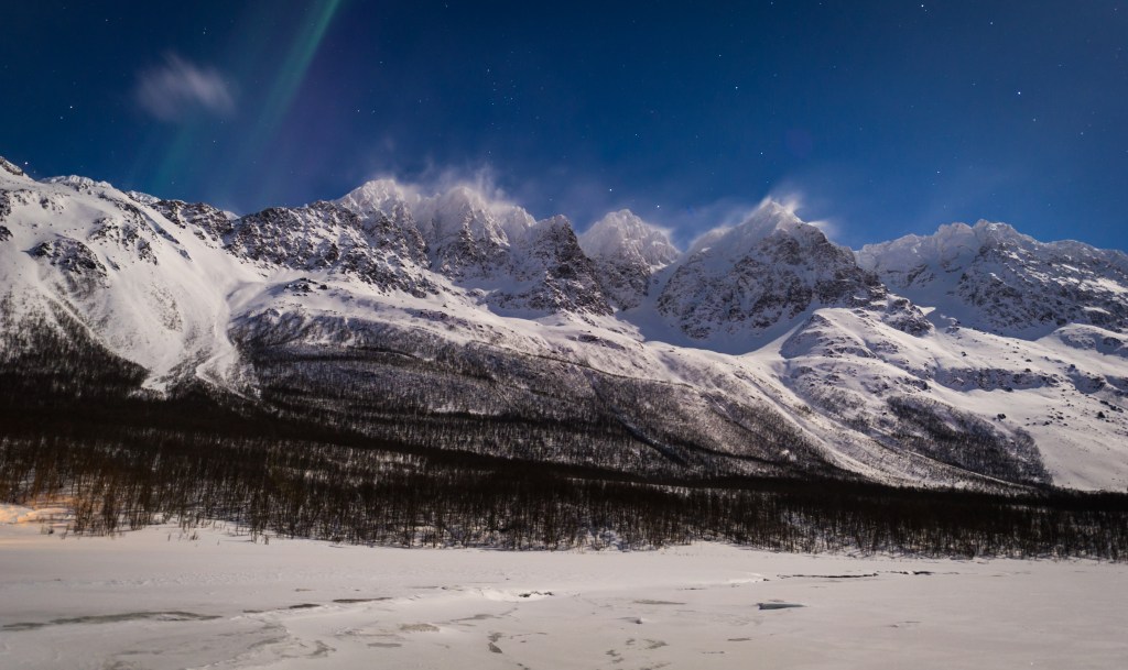 Yössä höyryävä Lakselvtindanen massiivi. Vihreeäkin näkyi.
