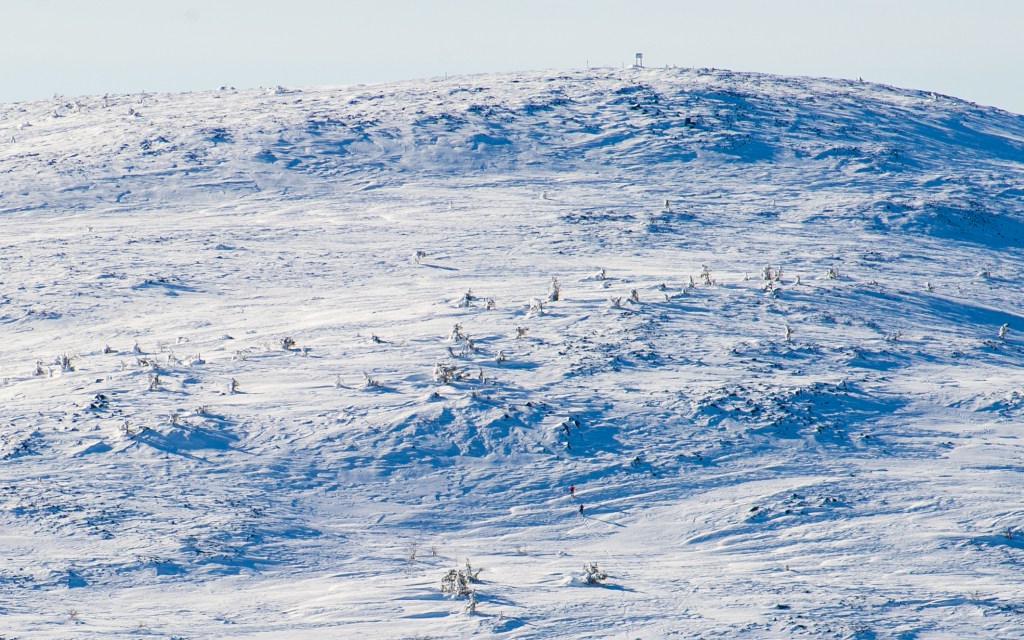 Muu poppoo nousemassa Noitatunturin päälle. Tarkkasilmäset huomaa kävelijät hangella.