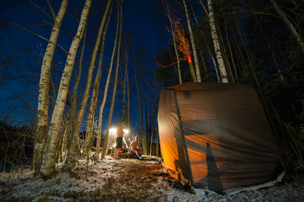 Puulämmitteinen sisäsauna ulkorakennuksessa toi vaihtelua telttasaunailuun. Illalla hampaita pestessä huomattiin että Reimon ilmalämmitin savuttaa tolkuttomasti.