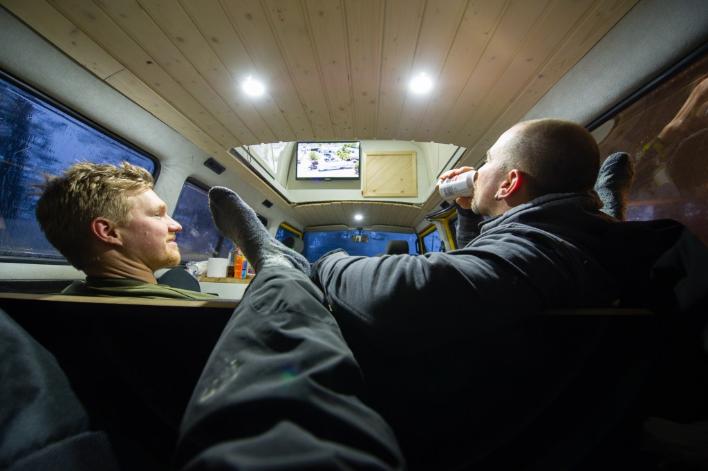 Mukavuuksien äärellä. Reimossa Madventures- Suomi telkussa ja kana nuggetit pannulla tirisemässä. Kuvaaja joutui konttiin, tilaan liian ahtaan linssin kanssa.