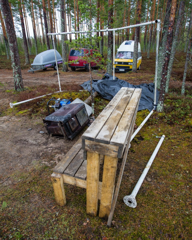 Vastoinkäymisiltä ei taaskaan vältytty. Vettä ei mökin ympärillä ole, joten kaverit purki saunakamppeet pois paljusta, ajovat läheisen järven rantaan ja imuroivat paljun täyteen. Reiluhko painolasti ja pehmeä mutavelli oli kuitenki liikaa ja jumi oli valmis.