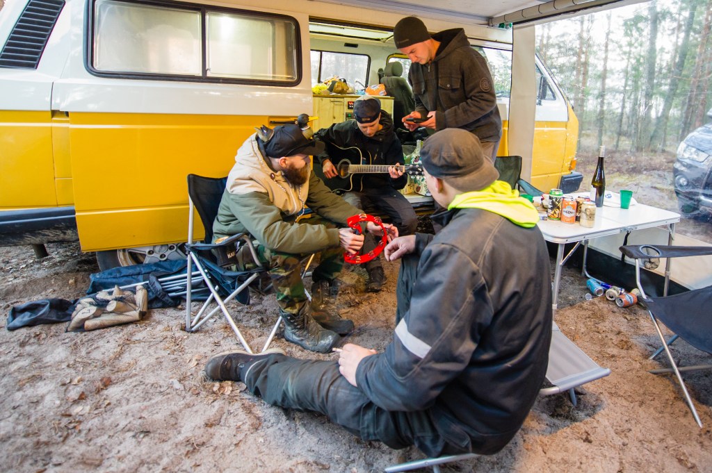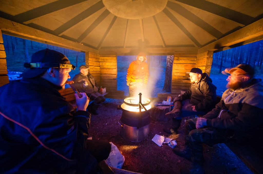 Illalla kylpemisten jälkeen koko kööri taas koossa nuotion ääressä