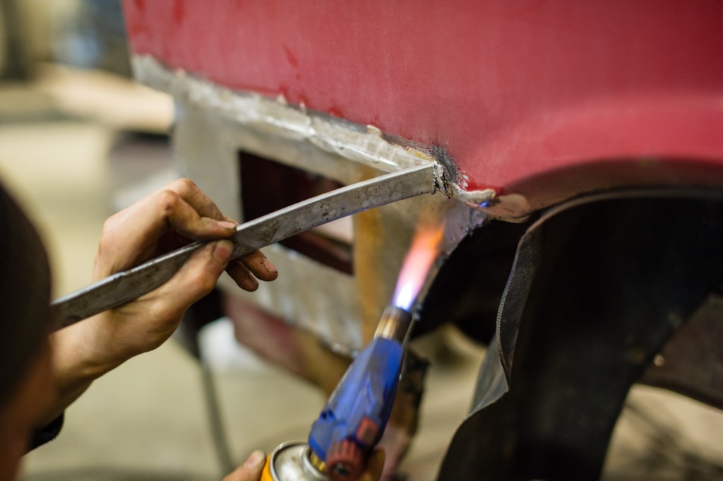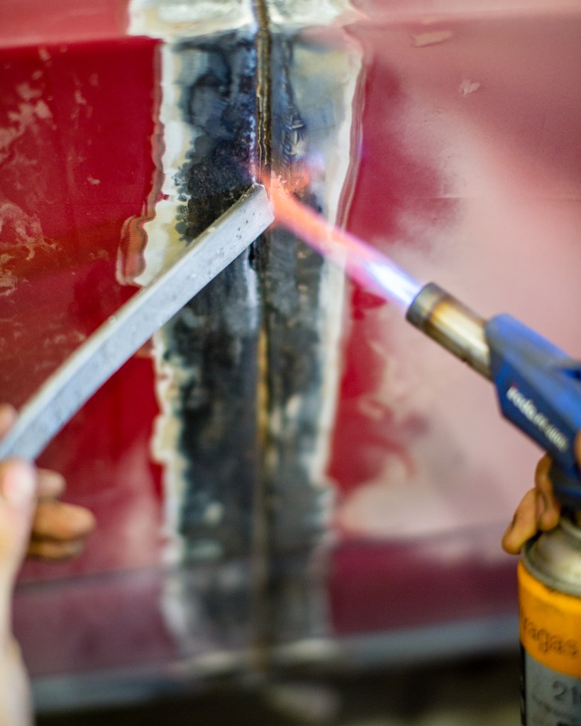 Ensin kylkisaumasta pinnat puhtaaksi teräsharjalaikalla. Pieni reikä tuli hionnan aikana. Jouni näytti miten kori-tinaa levitetään.