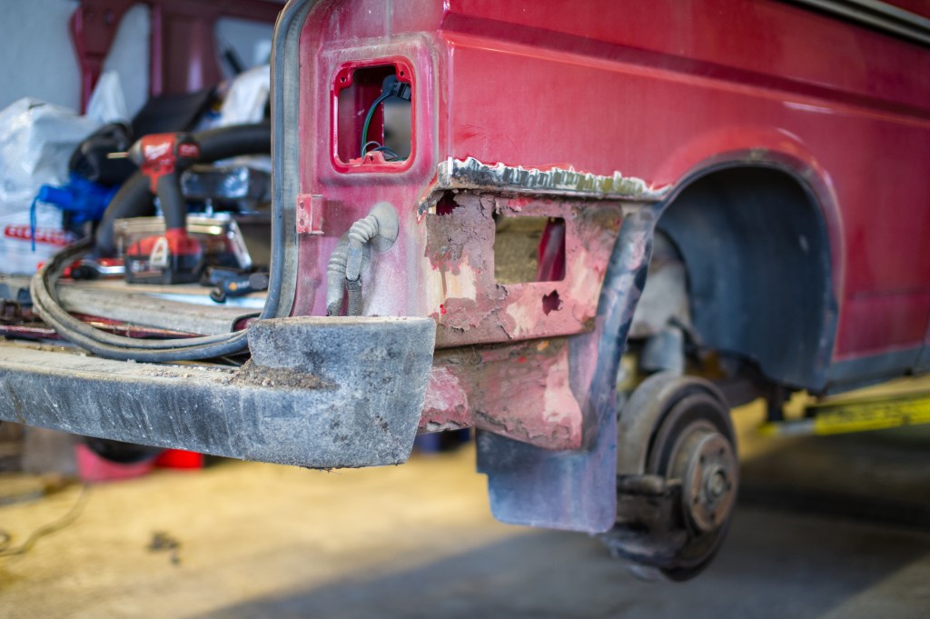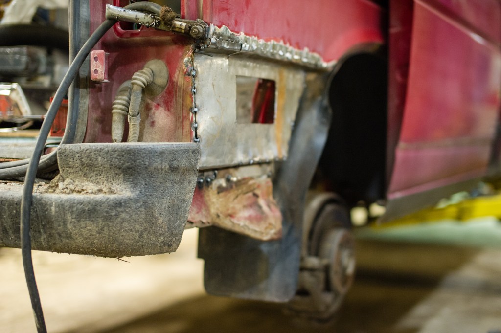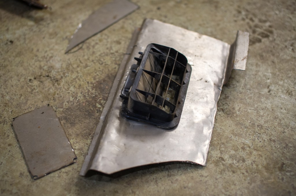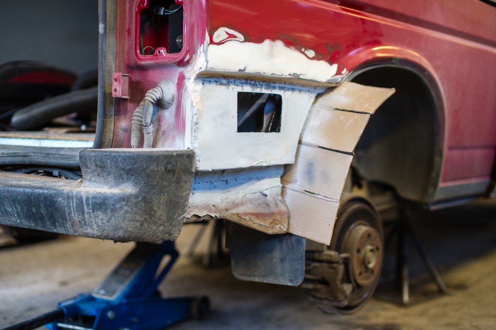 Takapuskurin alla korin sivuilla sijaitsee molemmin puolin muoviset ilmanvaihto venttiilit upotettuna peltiin. Muurahaiset käveli maalipinnan ja korin väliin kylkisaumassa ja maalipinta alkoi kuplia pois myös puskurin reunan kohalta. Oli aika kurkata puskurin alle. Sormi meni pellistä läpi venttiilien ympärillä. Ei hyvä..