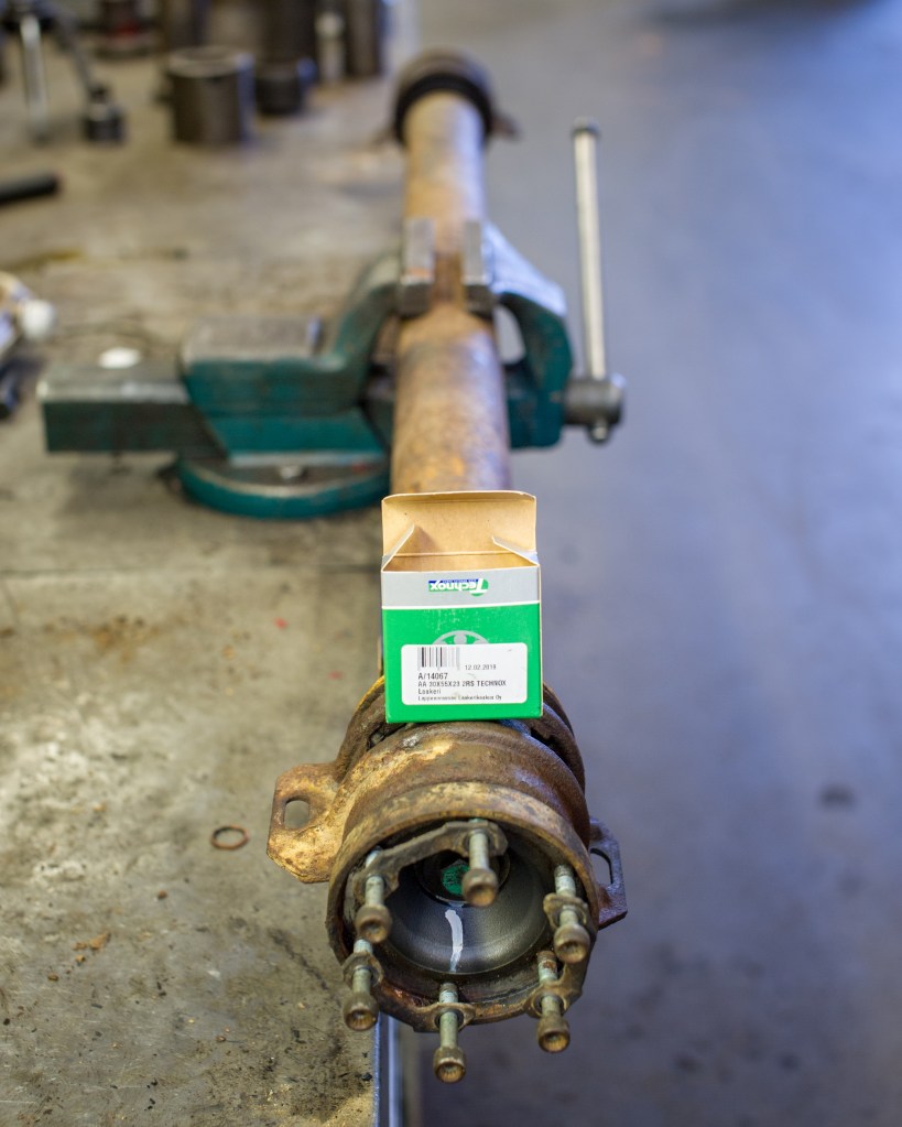 Ensimmäisenä hommana kannatinlaakereiden ja rättinielen vaihto viskon luo. Jälkimmäinen löyty käytettynä.