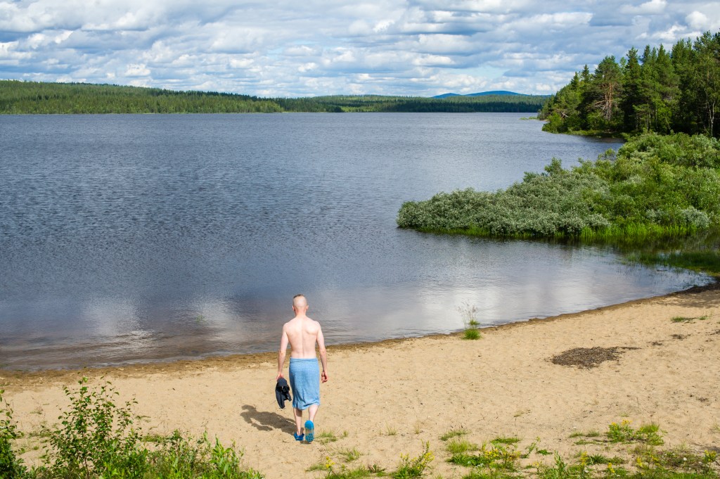 Illalla vesisateessa saunasta Guolasjärveen uimaan. Veden lämpötilasta ei tietoa. Vilakkaa joka tapauksessa. Minulla katosi toinen croksi jonnekkin matkalle. Jouduin tallailemaan kumisaappaat jalassa uimaan.
