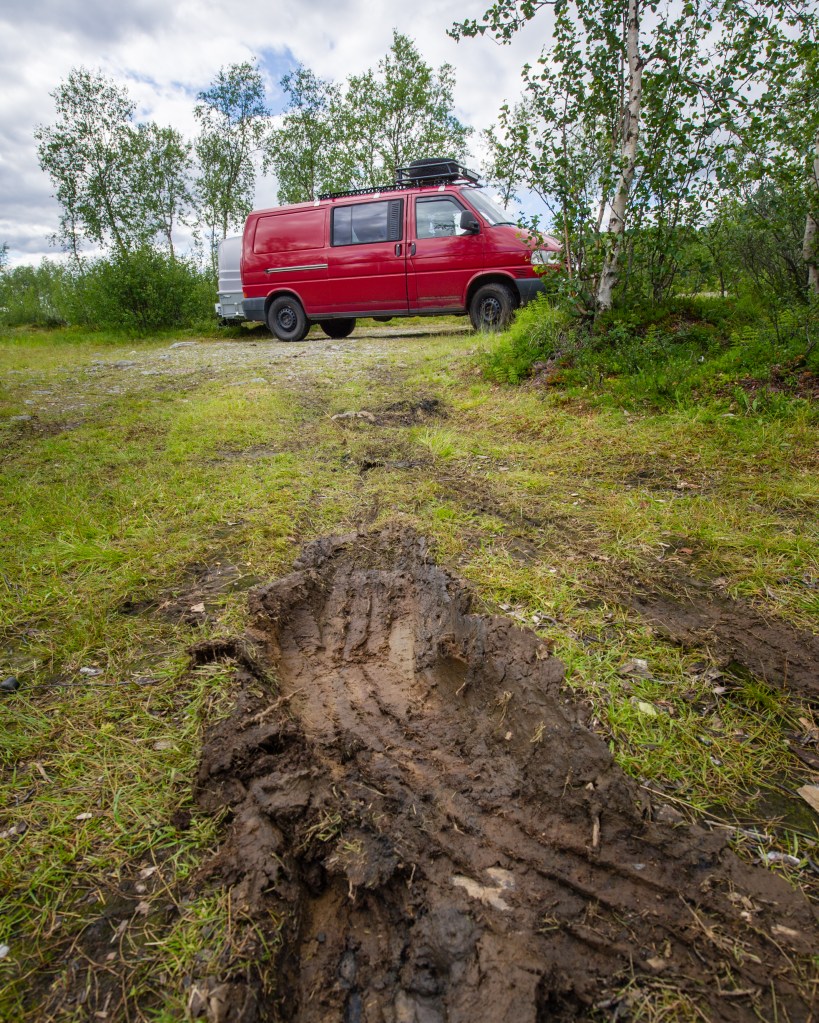 Meinasin jäädä jumiin mutaan. Sain yhistelmän irti lopulta ja tuuppasin vaunun pusikkoon puitten väliin ja irrotin sen. Ahtaus toi hiukan haasteita vaunun kanssa taiteilulle mutta ruuan jälkeen sain sihdattua kuitenkin aisan koukkuun ja taituttiin vielä ulos parkista.