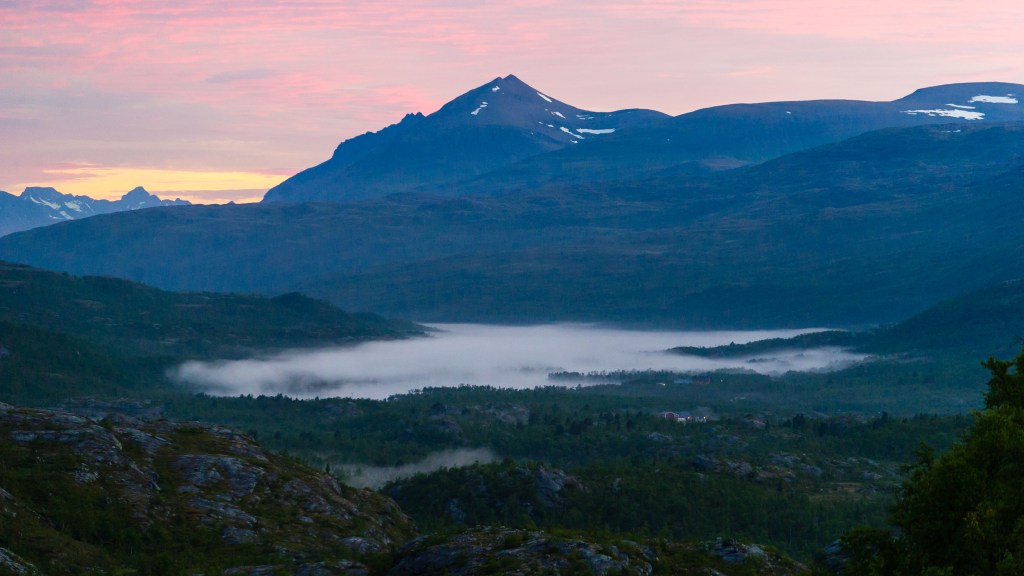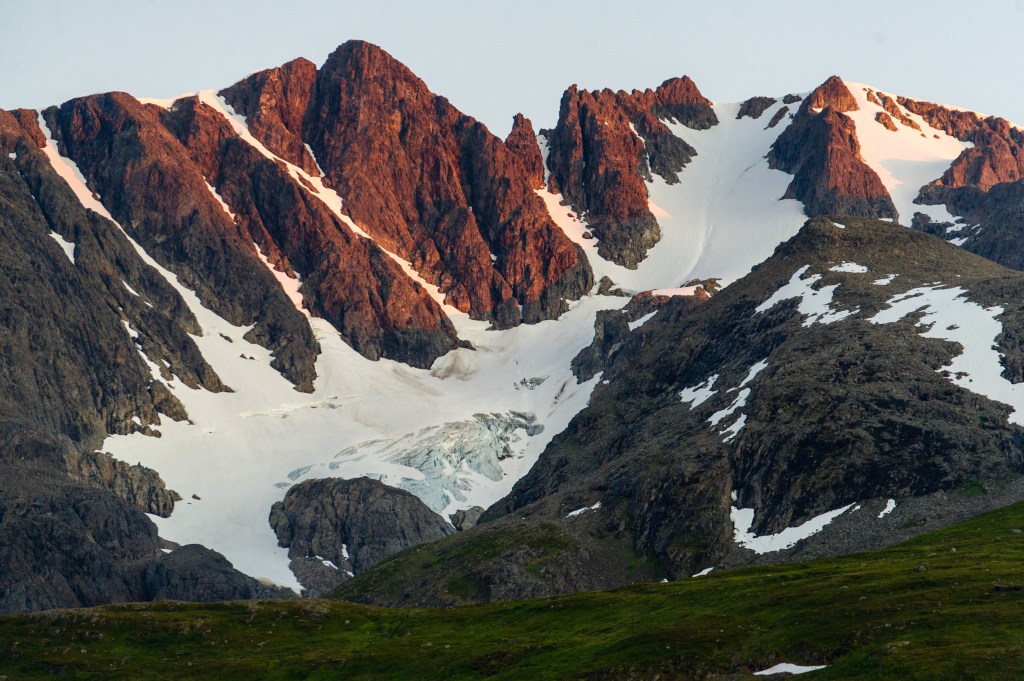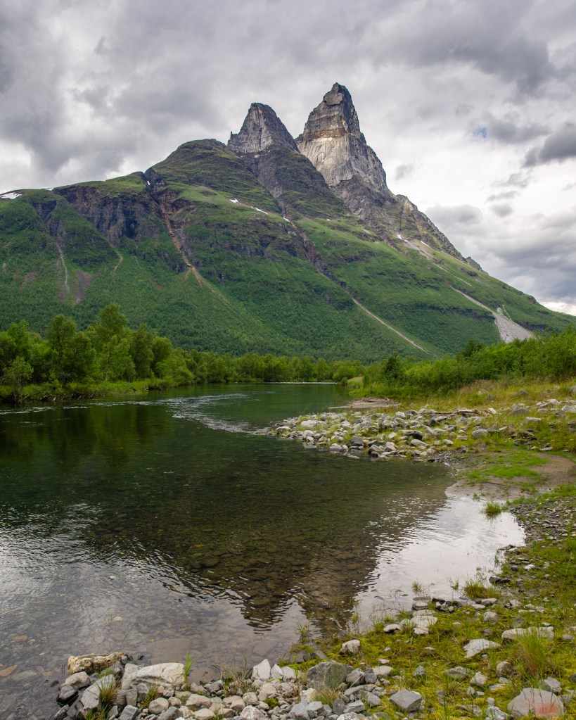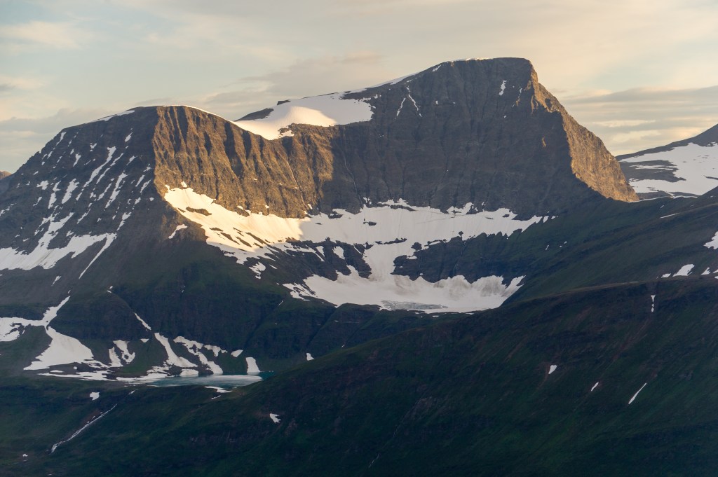 Polvartinden 1275m vasemmalla, Postdalstinden 1363m oikealla ja Lemmetfjelletin massiivi keskellä.
