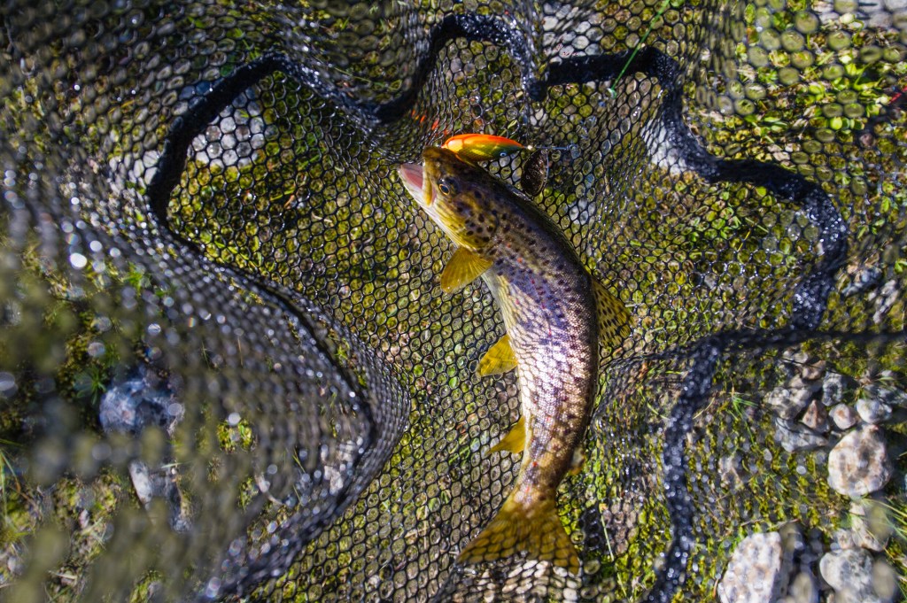 Pari heittoa ja noin 15cm harjus käväisi haavissa. Sitten tuli noin 25cm taimen, joka näissä vesissä täytyy laskea takaisin elävänä tai kuolleena. Ja käsittelyssä noudatettava äärimmäistä varovaisuutta. Kalaan kosketaan vain märin käsin, mielellään ei ollenkaan, haavin oltava kumihavaksellinen, kalaa ei saa väsyttää liikaa, koukut mielellään väkäsettömät. Yksi räpsy muistoksi ja kaveri takaisin jokeen.