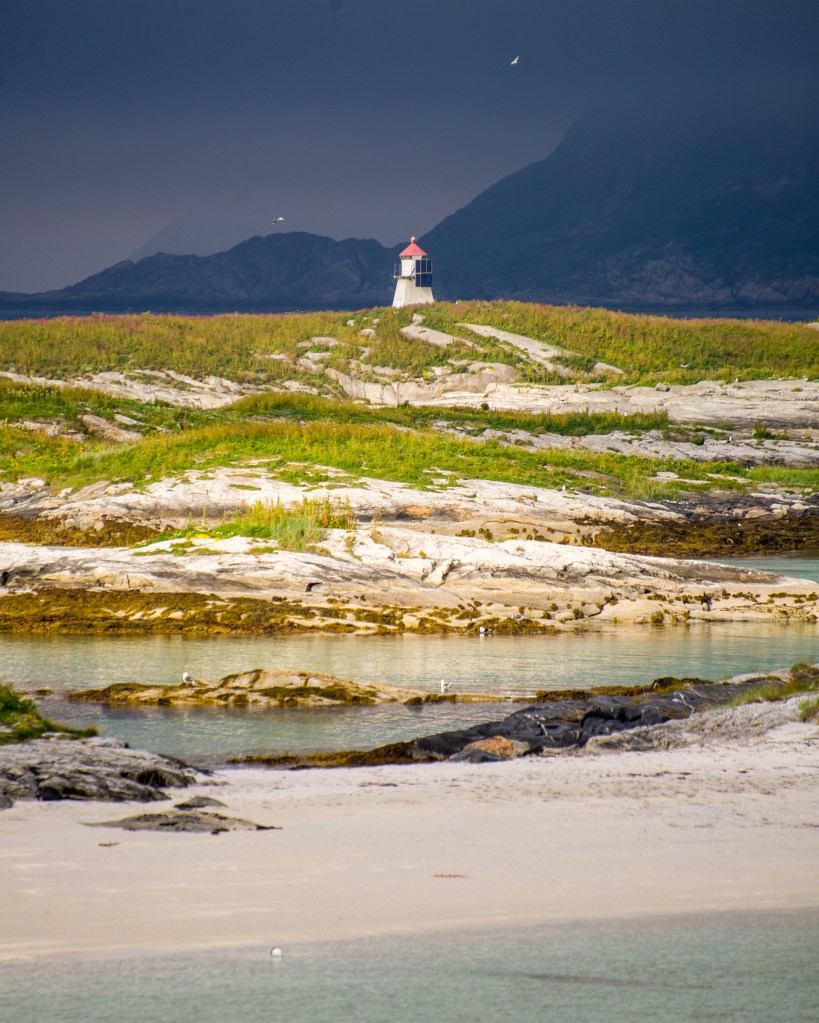 Majakka ja majakan hieno mökki. Ranta täynnä laivaromua.