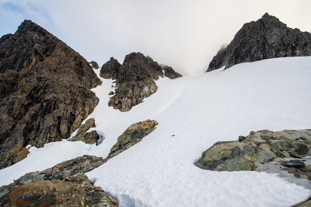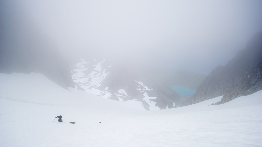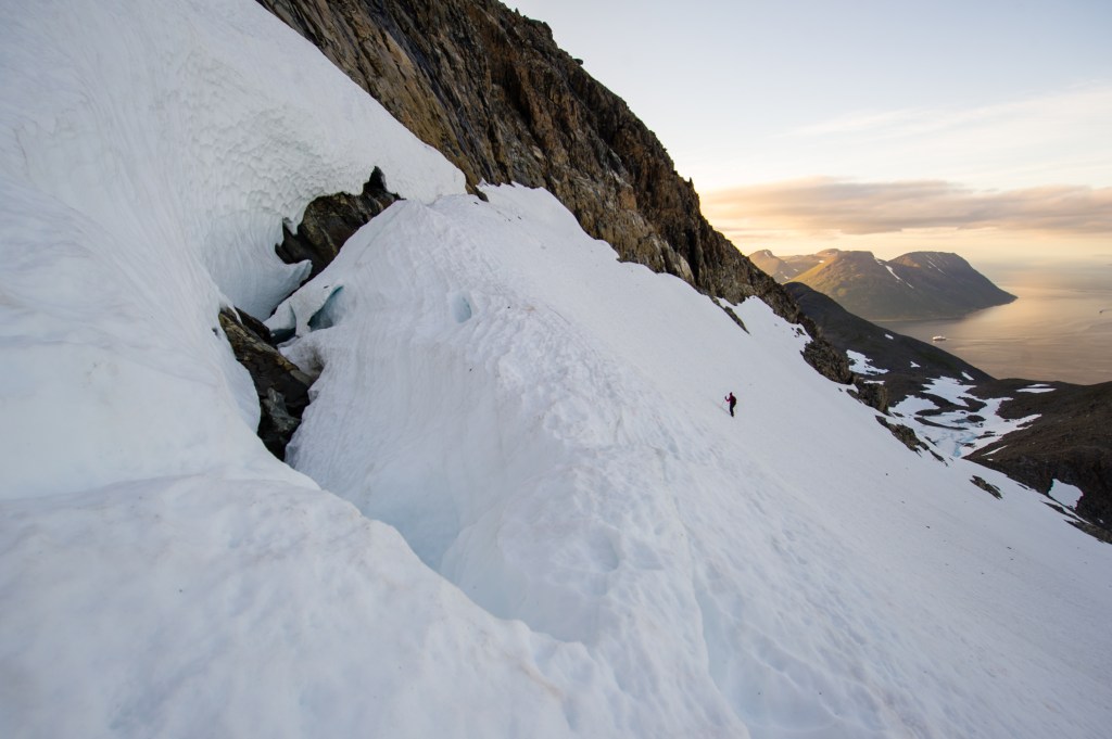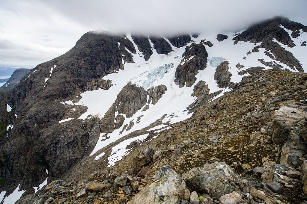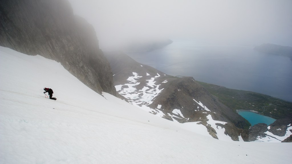 Suuri päivä. Oon odottanu tälle vuorelle nousua parin vuoden reissujen aikana yhteensä noin 7 vuorokautta Kågenilla olosuhteita kytäten. Nyt on oikeanlaista nousu seuraa mukana, ei tuule liikaa, huippu on pilvessä mutta nyt mennään.