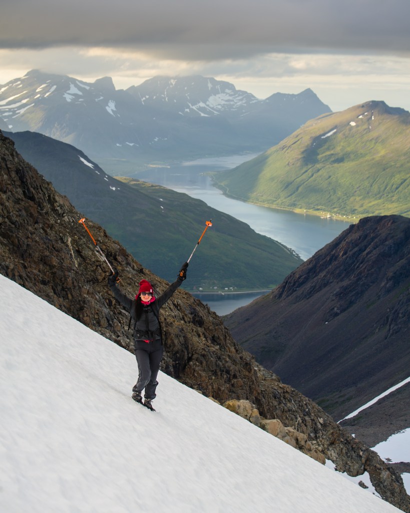 Noustiin ensin neljästään Antin ja Jaanan kanssa 677m harjanteelle, josta aukeaa aika hienot näkymät ylös Kågtindenille ja alas Skjervoyn suuntaan. Isbuktvatnet näkyy myös.