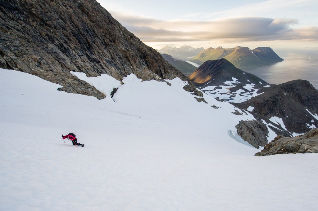 Jaana oli tulossa Suomesta Kågenille huomenna illalla. Tarkotus kiivetä Store Kågtindenille kuvassa näkyvää lumikurua pitkin. Mereltä näki hyvin ylös.