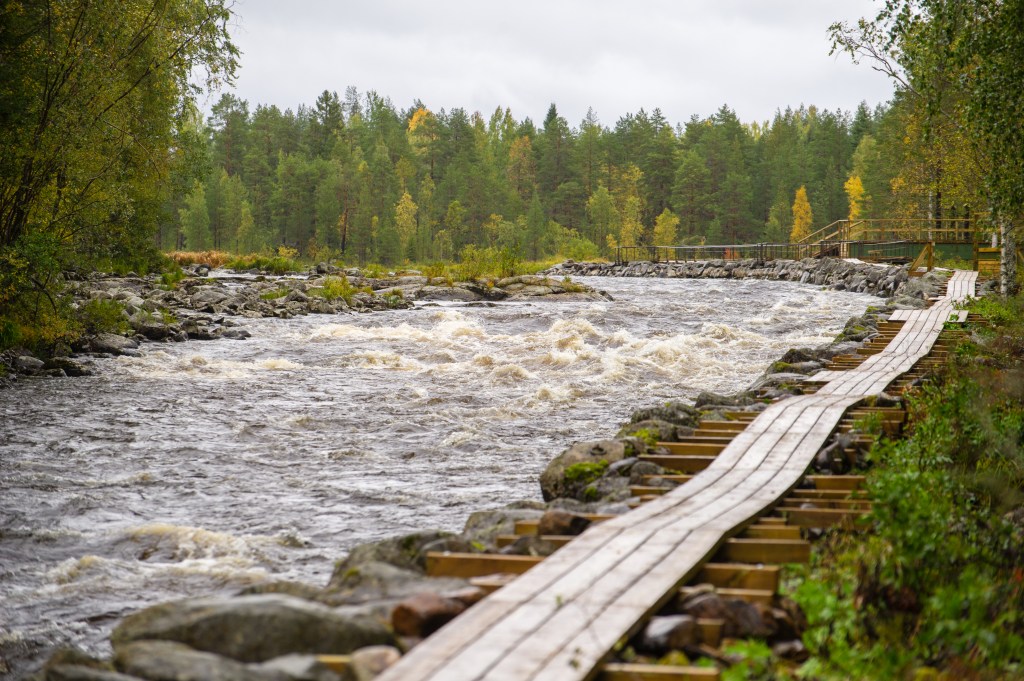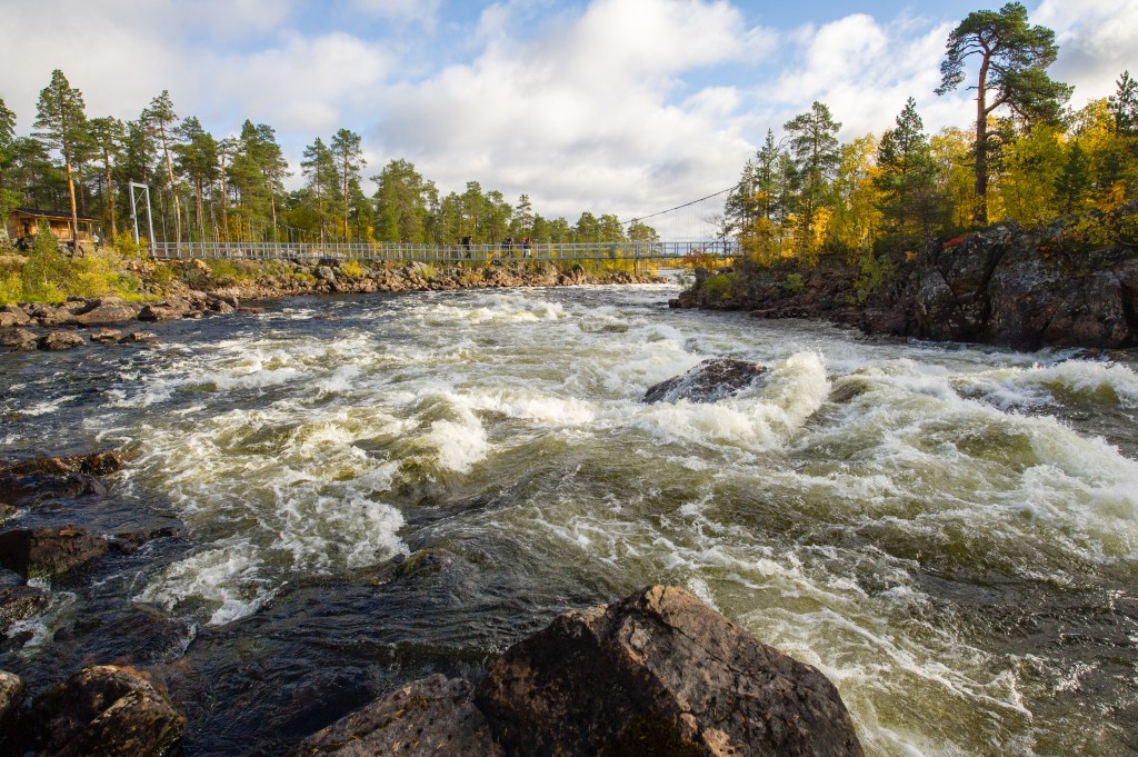 Ylös olisi autollakin päässyt, mutta tienhoitokunta haluaisi siitä käyttömaksun, mikä on täysin ymmärrettävää kun turisteja ramppaa siellä alvariinsa. Kylätalo oli kuitenkin kiinni sunnuntai päivänä, joten ei muuta kun kamat reppuun ja suon yli, että heilahtaa! Mini suon toisella puolella oli poroaita. Löysin justiin minun ja repun mentävän kolon aidassa. Puolisen tuntia tallasin ylämäkeen ja sain mielestäni riittävän hyvän näkymän joen ja sillan suuntaan.