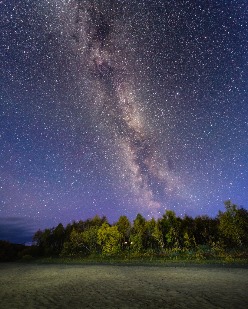 Kuitenkin, onnistuin taltioimaan teknisesti hienoimman linnunrata kuvan tähän mennessä koskaan. Leirin valot kiiluu puskissa. Taustalla Kaldoaivin erämaa ja lienee sanomattakin selvää, että valosaasteesta ei ollut tietoakaan. Kuun sirppiäkään ei ollu taivaalla.
