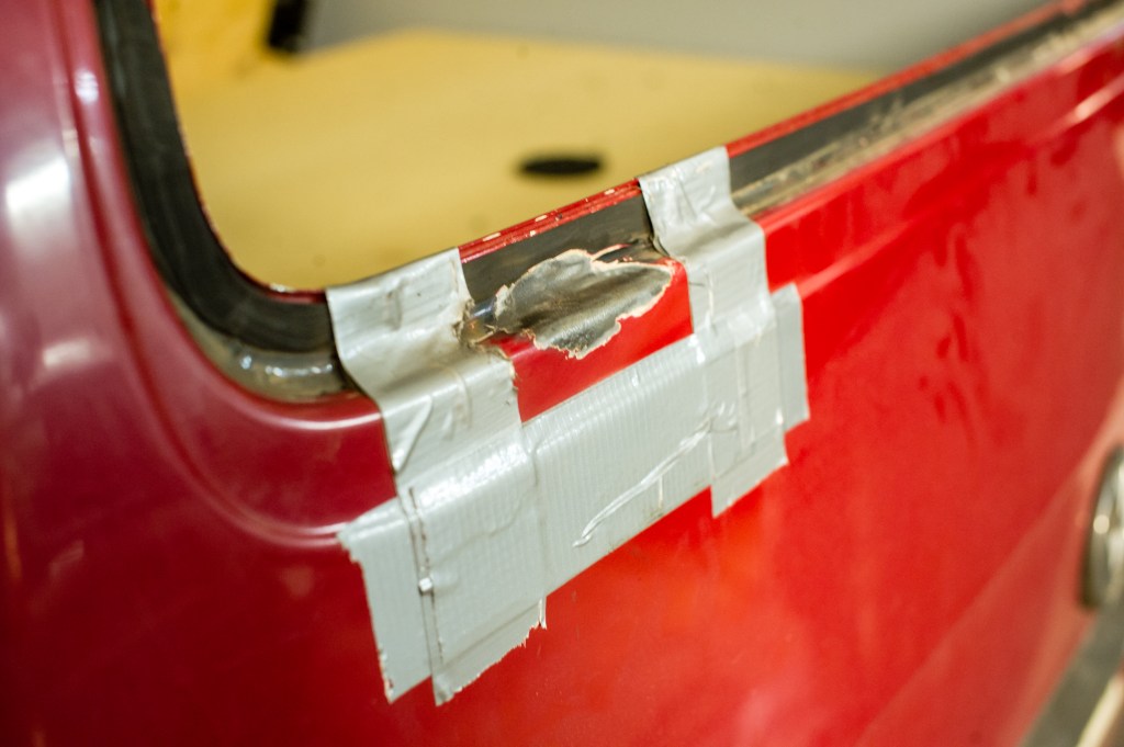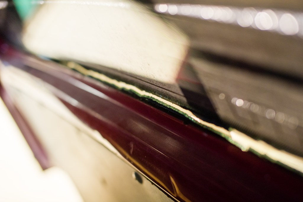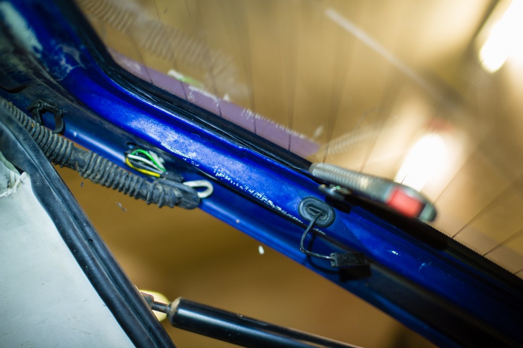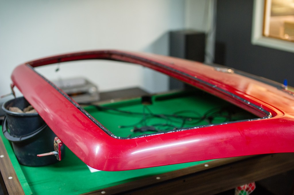 Lasi nousi paikaltaan sormineen nostamalla. Liimapinnat oli niin räässä ettei mitään järkeä. Yksi ilta putsailtiin pintoja. Lopulta otettiin luukku irti uudelleen ja raahattiin autokyydillä se muualle lämminvesipainepesurin luo. Sillä suihkimalla liimat pikkuhiljaa lähti pois.