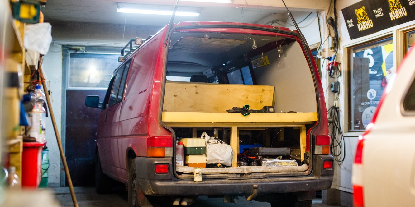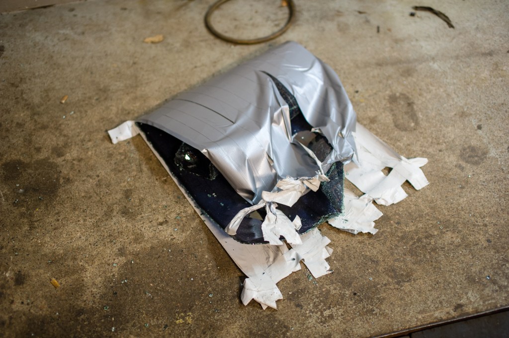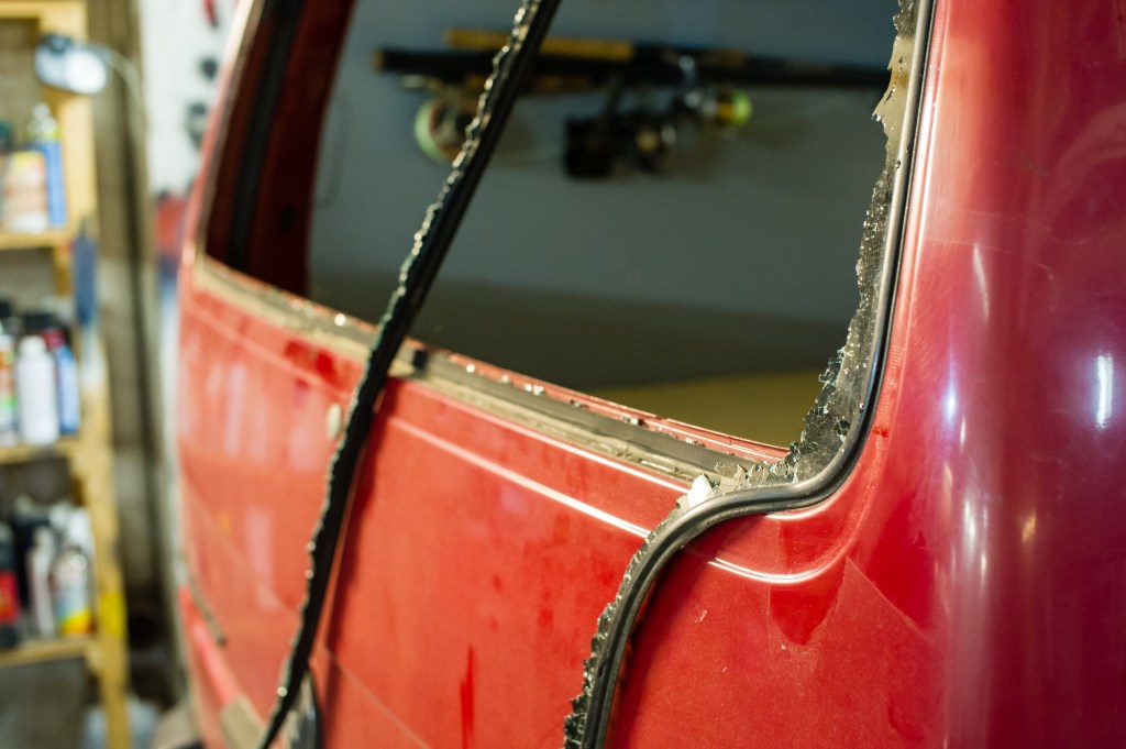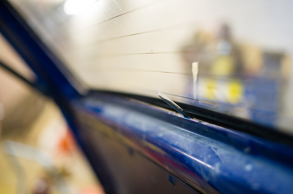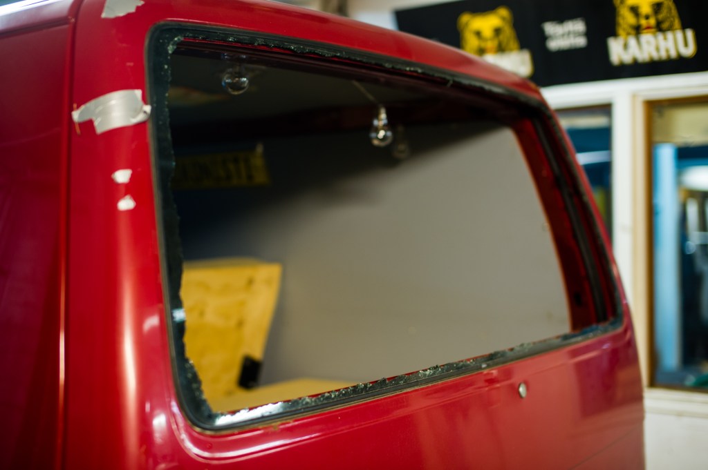 Ensimmäinen jobi oli irrottaa varaosa autosta uusi lasi ehjänä.