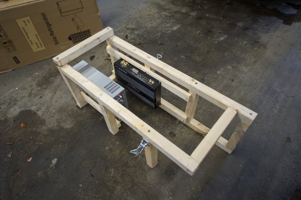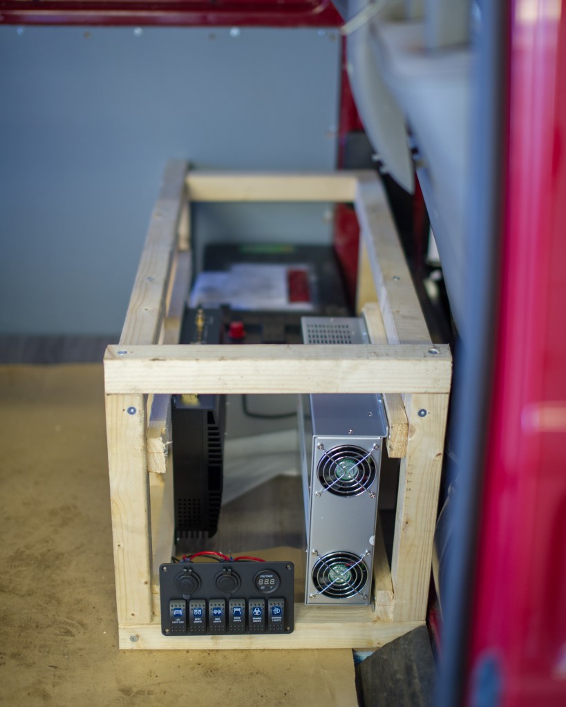 Niin sanotun sähkökeskuksen askartelua. Pitää sisällään 225ah AGM akun, subin vavarin, invertterin, sulakkeita, katkasinpaneelin, lataustöpseleitä ja volttimittarin.