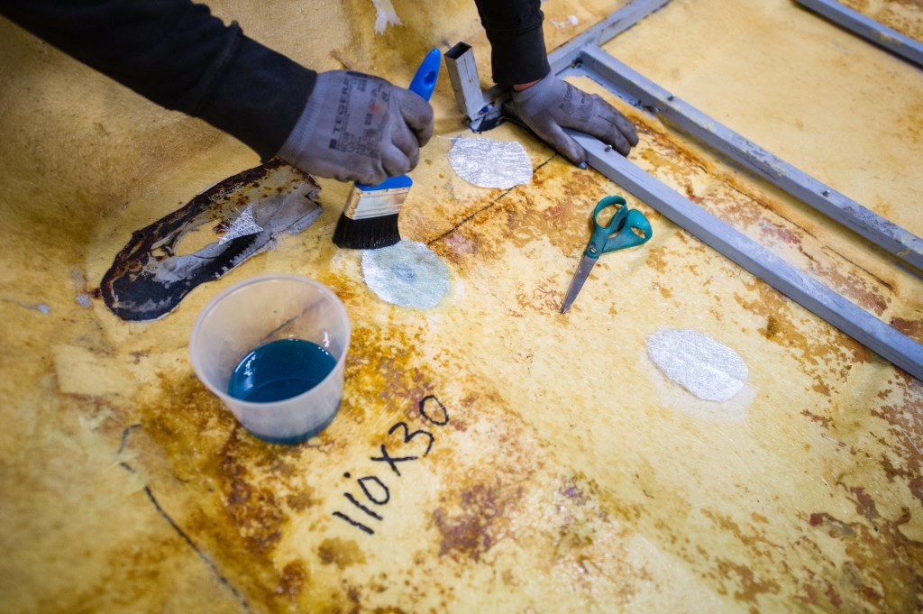 Reikien paikkauksen, pinnan hionnan ynnä muitten putsailujen jälkeen testisovitus ja hahmottelu, kuinka liimaus tullaan tekemään.