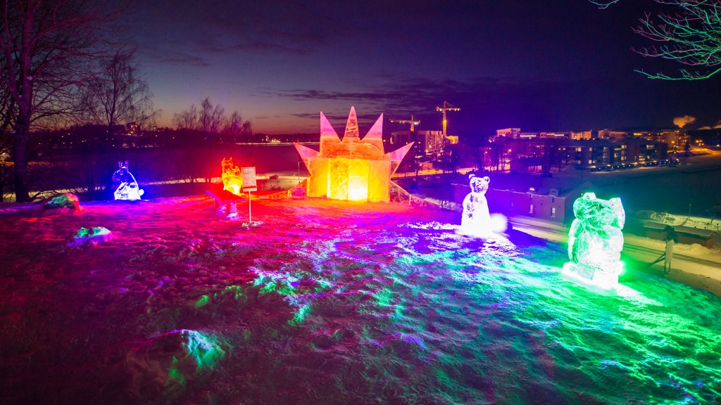 Kuvataidekoulun takana värikkäitä veistoksia. Parit ujot laskut samalta kulmalta alas puistoon.