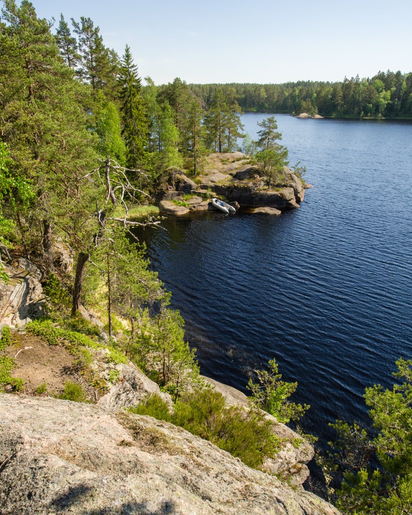 Soudettiin järven toiselle puolelle isohkolle kalliolle smyygailemaan mahdollisia kiipeilylinjoja. Yksi DeepWaterSolo traverssi löytyi aivan veden pinnasta. Sen verta iisi oli kuitenkin että jäi kastumatta.
