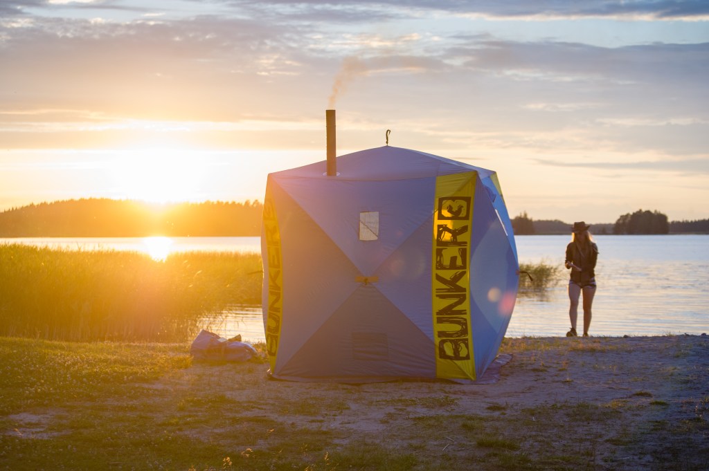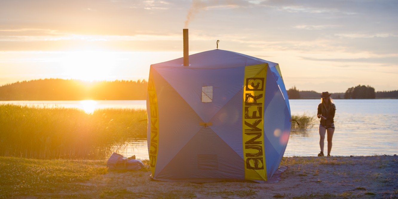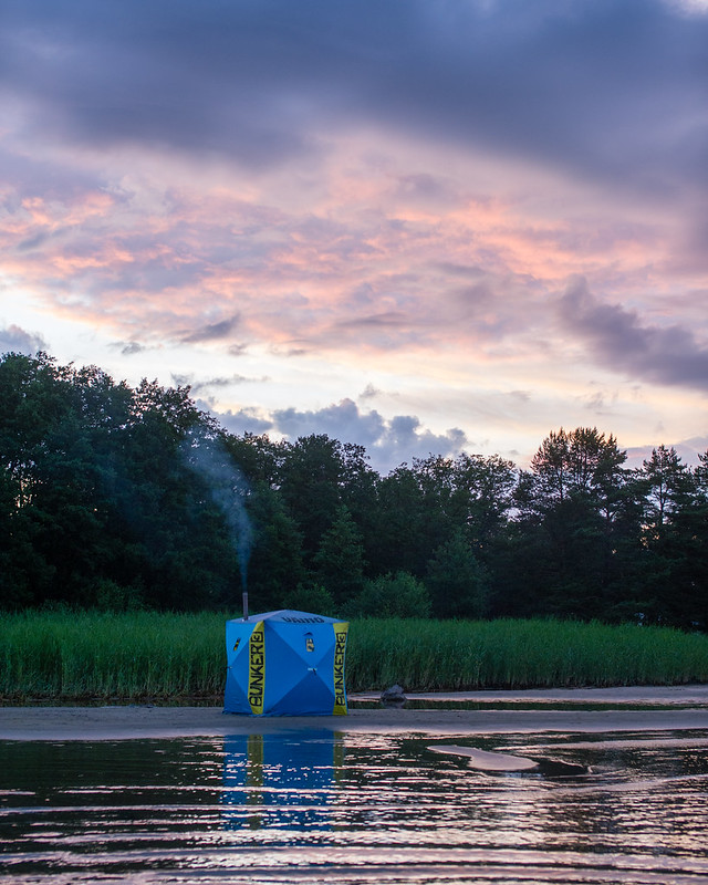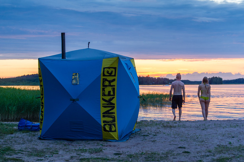 Sauna pystyyn auringonlaskussa ja juhannusaatosta nauttimaan.