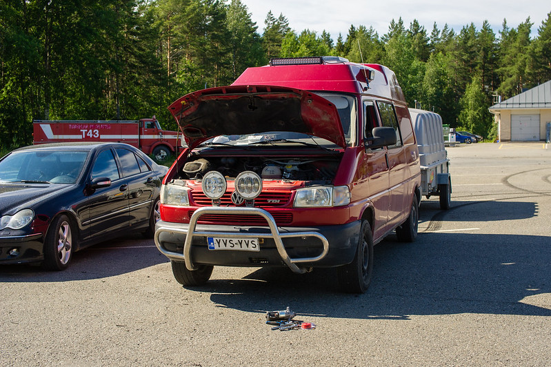Yyterin teboililla tankkaamisen jälkeen startti antoi viimeisen rusauksen. Ei auttanu solenoidin naputtelu. Yritettiin työntämällä käyntiin. Huoltamolla oli monta avuliasta heppua ja tulivat työntöapuun. Saatiin auto hyvään vauhtiin, 3 pykälä silmään ja kytkin ylös. Auto pysähty kuin seinään. Moottori oli jumissa?!