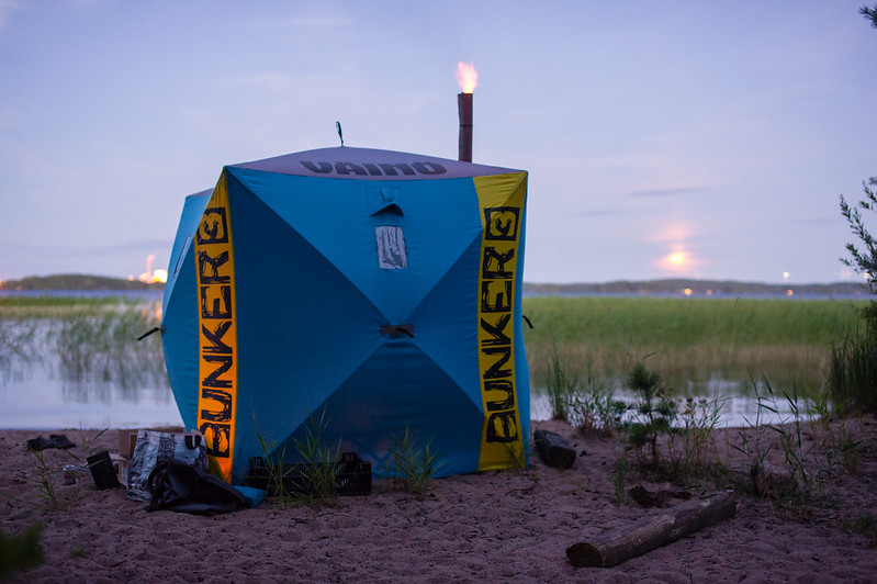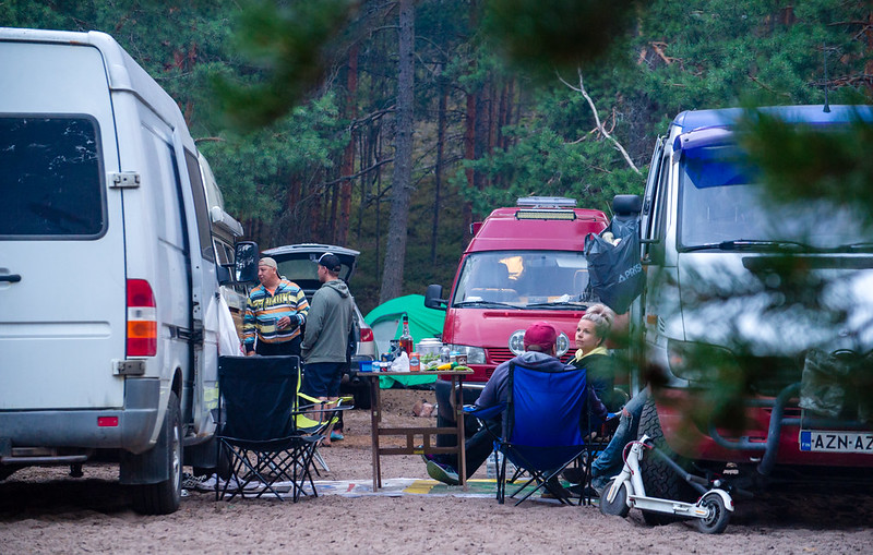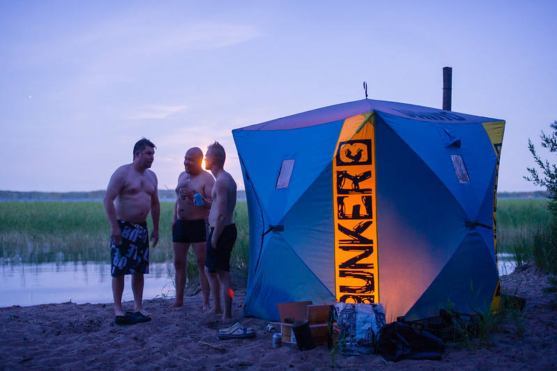 Kaupan kautta rannalle ja illalla tuttuun tapaan sauna pystyyn. Leiri koostui tällä kertaa myös muista saksalaisista kulkineista.