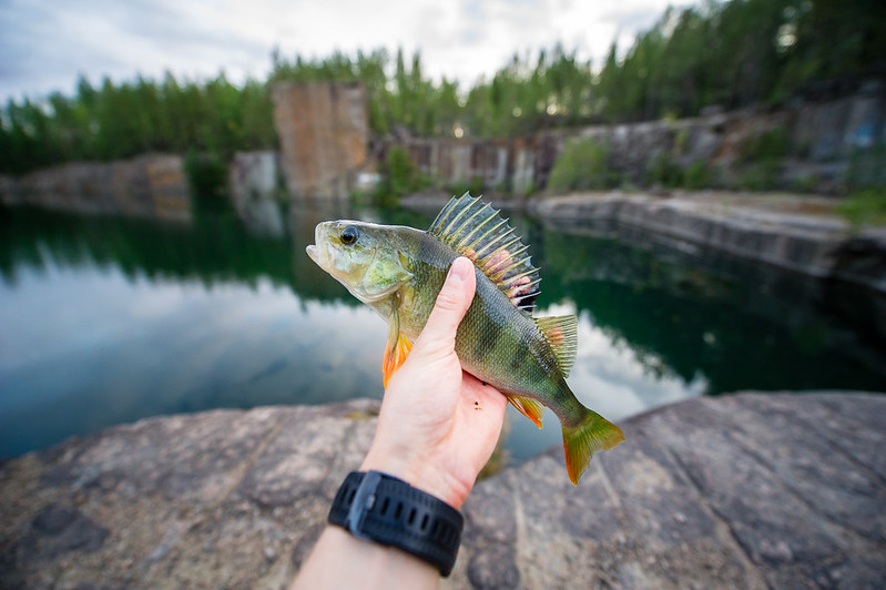 Neljännellä heitolla siima kiristyi ja vedestä nousi varsin malli yksilö ahvenesta.