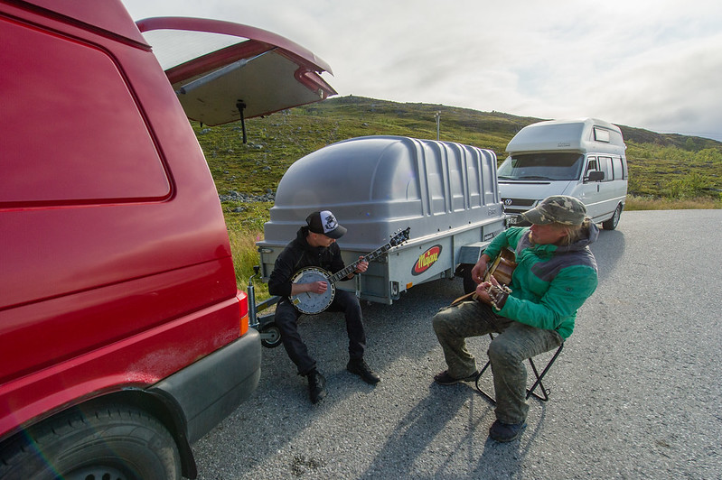 Sitten kauppaan ostamaan viikon ruokatarpeet. Kaupan pihaan kurvasi taustalla näkyvä westy. Punasen ja valkosen kuskeilla kiilui silmät. Puoltatuntia myöhemmin oli banjo ja kitara reivit käynnissä Muotkatakan levikkeellä. Mahtavia kohtaamisia taas 😀