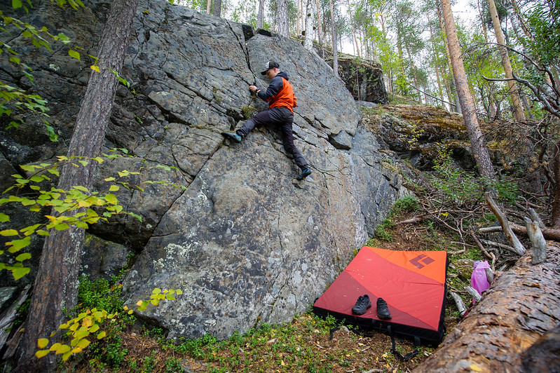 Jälleen kerran vastassa sama ongelma kuin muilla kivillä. Valtahalkeamaa pitkin alhaalta ylös menevä 3 reitti jäi tekemättä korkeuden takia, mutta oikeessa laidassa oleva viitonen paljon monimutkasemmilla muuveilla meni flashaten.