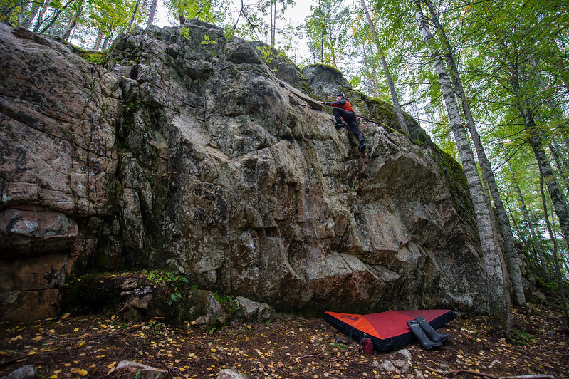 Loppuun yritin ekaa 6a+ reittiä ikuna. Oikealta istumalähdöllä lähtevä traverssi joka päättyy tähän samaan korkeaan nousuun jossa kuvan hyypiö pyllistää. Cruxi kohdan otteettomuus koitui kohtaloksi ja tuo jäi tekemättä.