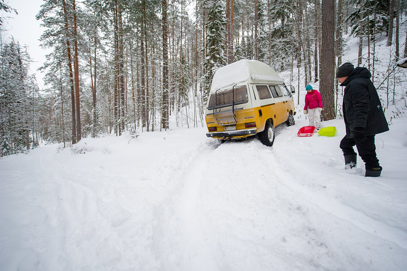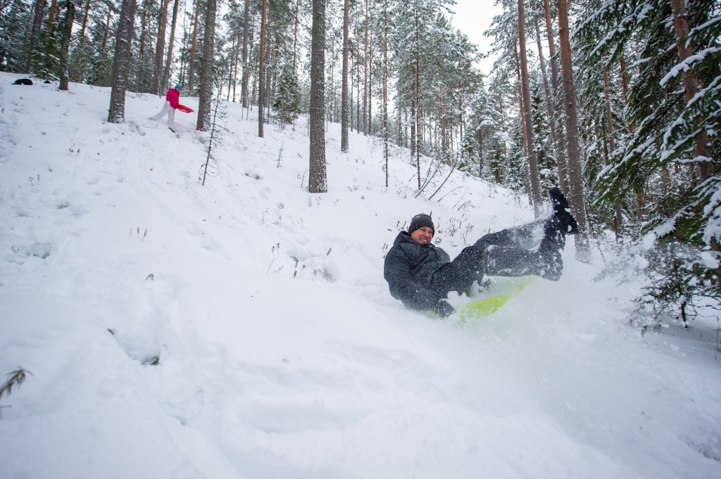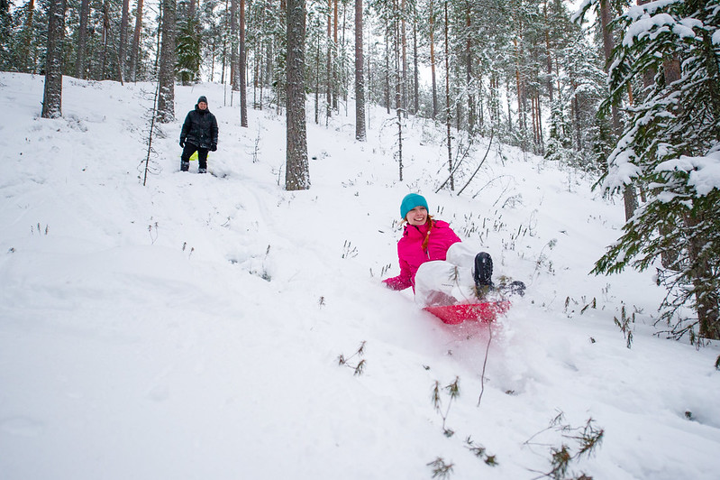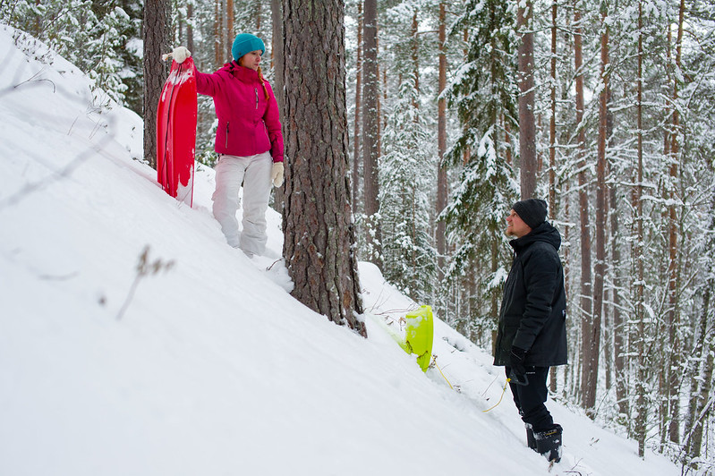 Anttikin saapui paikalle. Otettii pulkat mukaan ja lähettiin ajamaan umpihankeen auraamatonta tietä pitkin harjun juurelle.