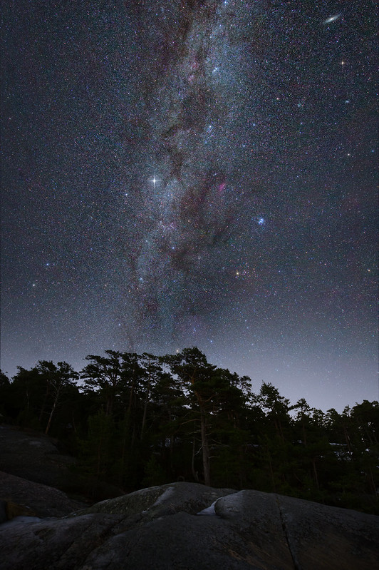 Hetken pohdin mihin suuntaan kuvata, mutta Upinniemessä olleen sotaharjotuksen ja valosaasteen vuoksi päädyin Linnunradan ns pimeämpään, eli Orionin puoleen.