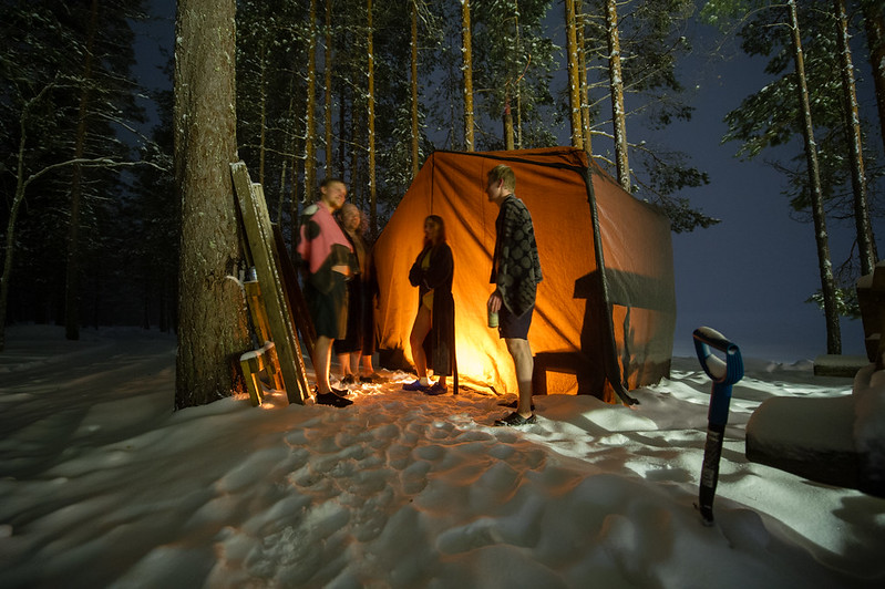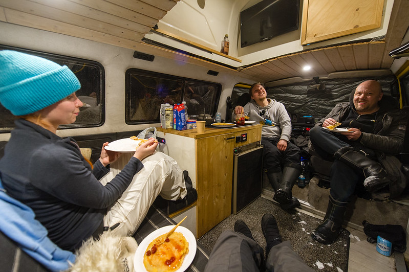 Herättiin 9 aikaan kun traktori kurvasi leiriin ja pöllytti meille lumilingolla väylän auki takasin parkkipaikalle. Lumityöt toimii rannalla paremmin kun kaupungissa!