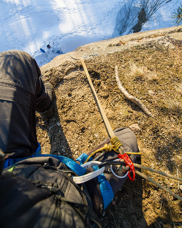 Seinällä oli useita sport reittejä, ja siten oli valmiita pultti ankkureita useempia. Köytin itteni puuhun kiinni ATC:llä ja prusikilla ja hivuttauduin lähemmäs kallion reunaa. Olisi tarvinnu laskeutua alemmas kalliolle ankkurin tasalle, jotta olis saanu helposti kiinnitettyä slingin ankkuriin. Mutta ei uskallus riittäny vielä ekalla kerralla joten kurkin ylöpuolelta takapuoli krampissa ankkurin ylös ja solmin toisen pään leivonpäällä ankkurin alempaan pulttiin, toinen pää ruuvisulkurenkaalla toiseen pulttiin ja tasapainotus solmu olikin sitten aivan mahdoton ylösalasin. Ankkurin pultit kun on eri tasossa ja nostan slingin ylös ja tasaan kummankin haaran solmulla, alas laskettuna tasapainotus muuttuu pulttien ollessa eri tasossa peilikuvaksi eli lyhyempi sivu siirtyy toiselle puolelle, jollonka koko komeus roikkuu vaan toisen haaran varassa. 10 kertaa lienee yritin saada arviolta solmittua solmun oikeaan kohtaan ja lopulta onnistu. Sitten vielä kaksi ruuvisulkurengasta portit ulospäin osoittaen slingiin ja köysi niistä läpi.