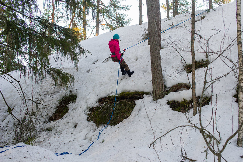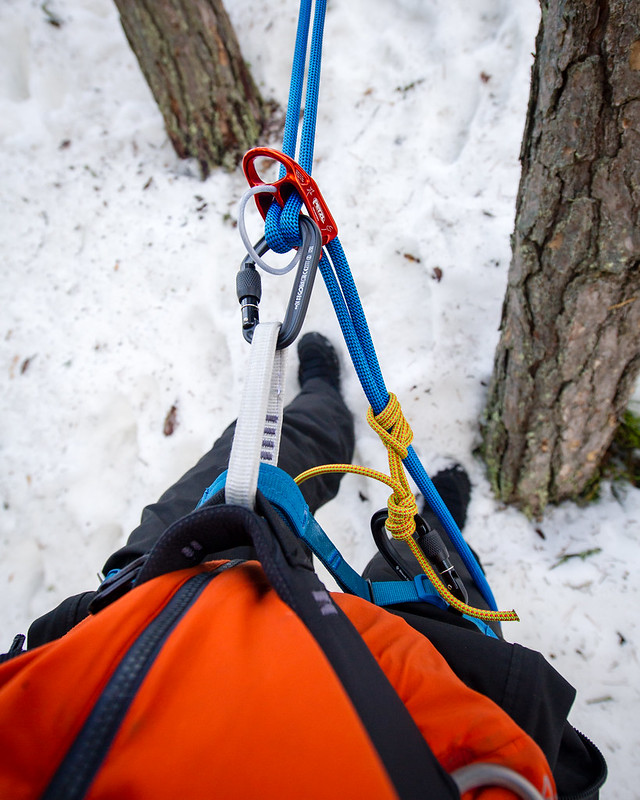 Seuraavaksi narut kainaloon, ankkuri puuhun jyrkänteen päälle ja kokeilemaan toimiiko kotona olohuoneen patterissa opeteltu Prusik solmulla toteutettu toisiovarmistus ATC:n perässä.