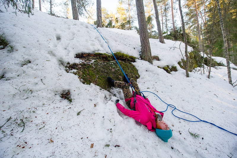 Käveltiin takasin alas ja köytettiin ensin minut naruun ja sanni jäi varmistamaan. Ensin reilu metri ylös ja testi istunta valjaisiin. Köyttä on seinällä tuplat, ellei triplat verrattuna kotikiipeilyhallin köysiseinään. Jousto matka köydessä siis huomattavasti suurempi. Takapuoli oli miltein jo hangessa ennen kun sannikin irtosi hangesta ja keikuttiin molemmat narussa hetki 😀 Hyvä että kokeiltiin ennen ylemmäs siirtymistä!