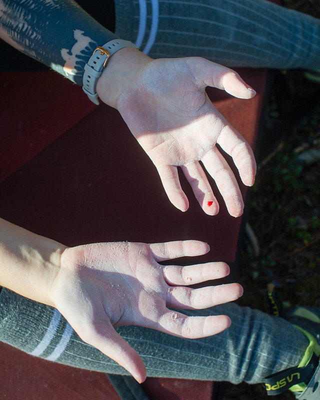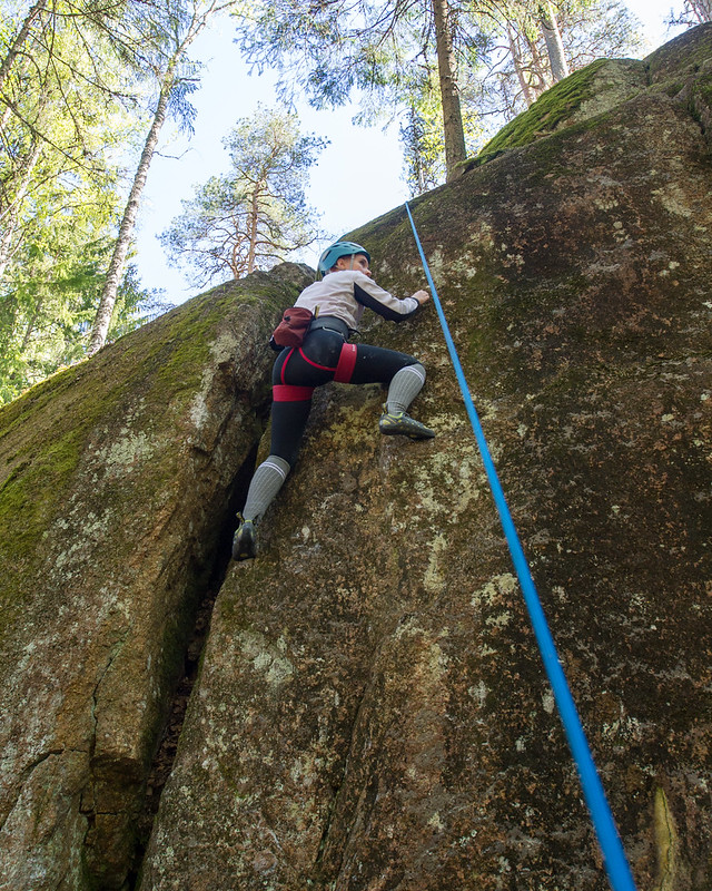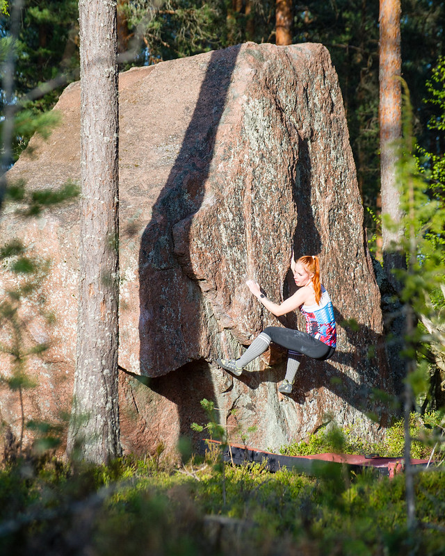 Muutama helpompi reitti alkuun ja lopuksi Sanni yritti ”Huhuilu traverse, 6a+” istumalähtöä. Kiven laatu oli tällä kivellä todella terävää. Sormet oli verillä aika sukkelaa!