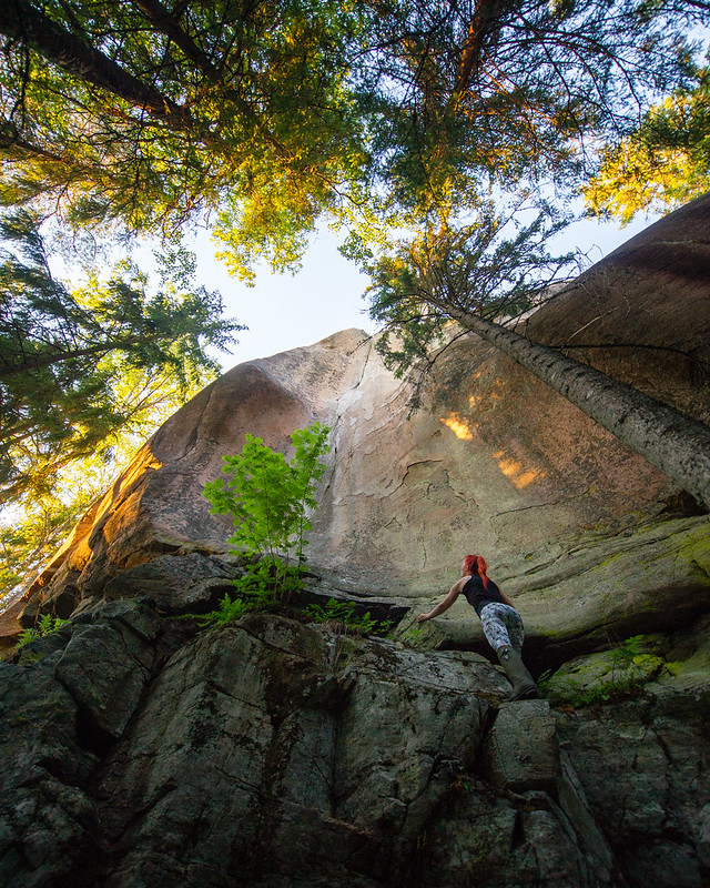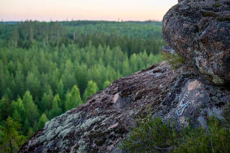 Kallion seinässä on 12m korkea töykeän hieno osittainen hiidenkirnu, jonka keskellä halkeamaa pitkin menee yksi Suomen vaikeimpia kiipeilyreittejä. Kirnu kiinnosti kovasti kuvaamisen suhteen ja sain pirun hyvän idean, että laskeudun köydellä tuonne kirnun yläreunalle räpsimään kuvia yläältä.